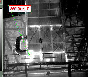 The above Thermogram is of a refractory lined panel of a Primary Reformer. The refractory material fell off and the result was this major overheating of the external shell panel.